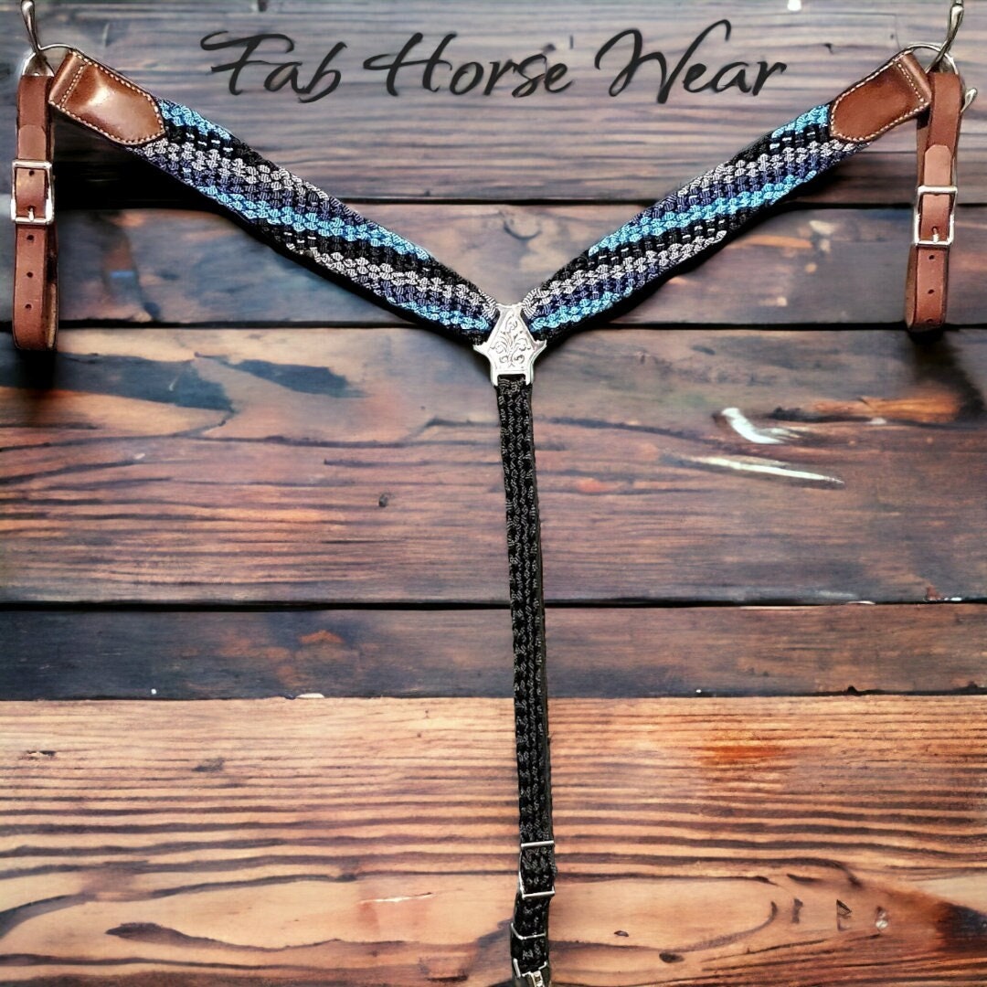 Built for both looks and longevity, this custom-colored mule tape breast collar is handcrafted and dyed in Michigan for a one-of-a-kind finish. Braided with heavy-duty 1,200 lb test mule tape and paired with rich leather accents, it's as tough as it is striking—perfect for everyday riding, trail adventures, or making a bold statement in the ring.