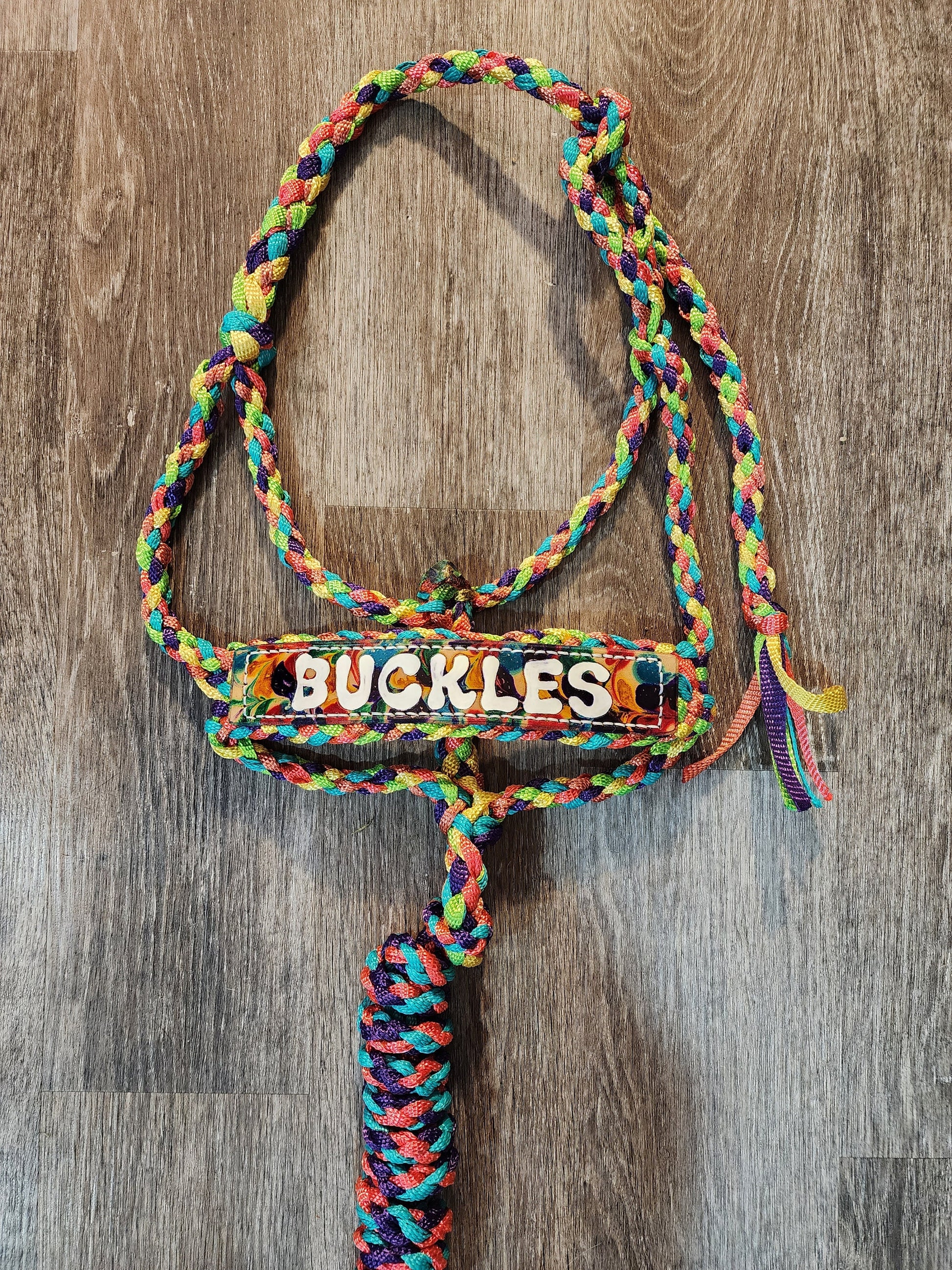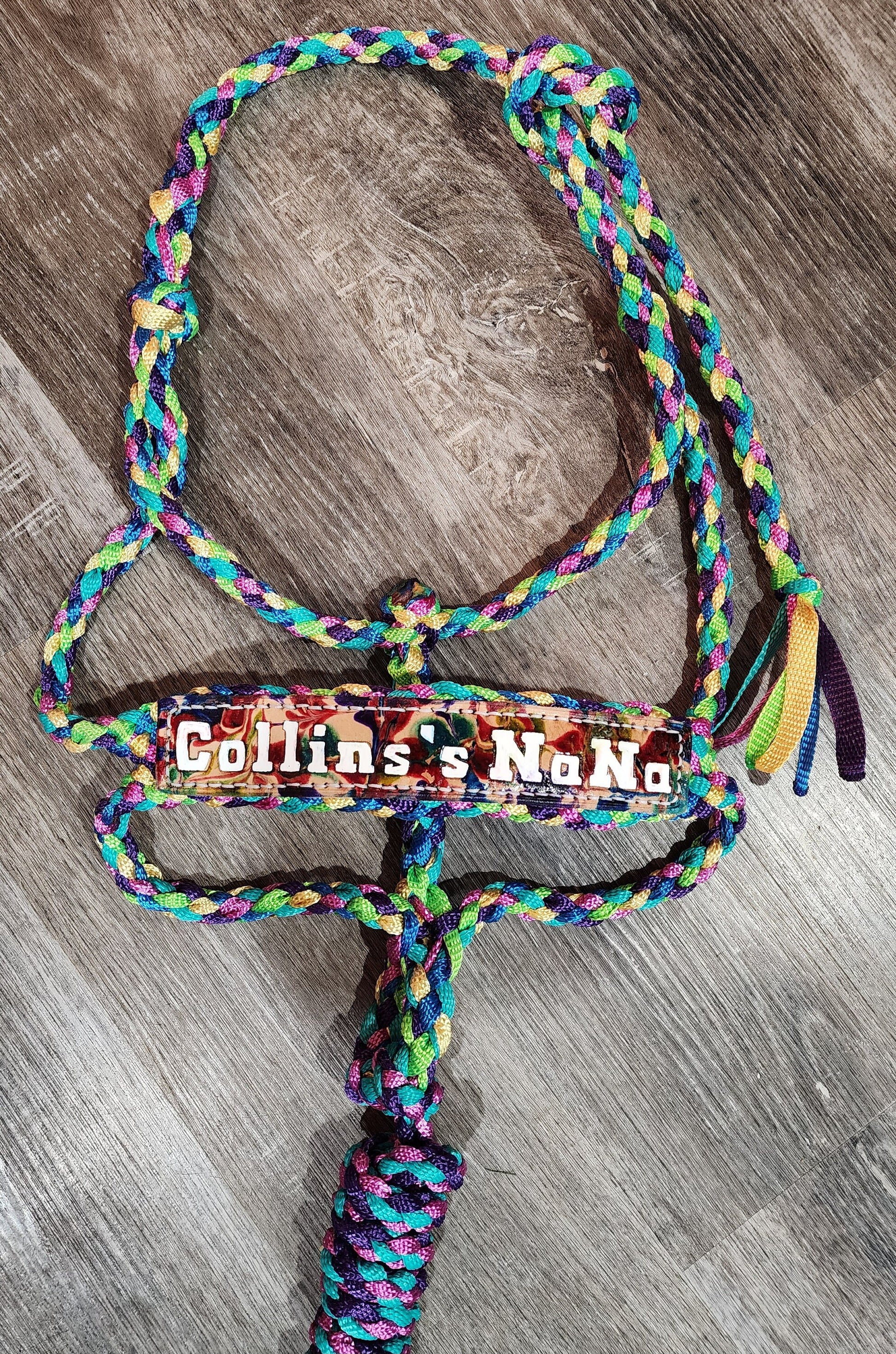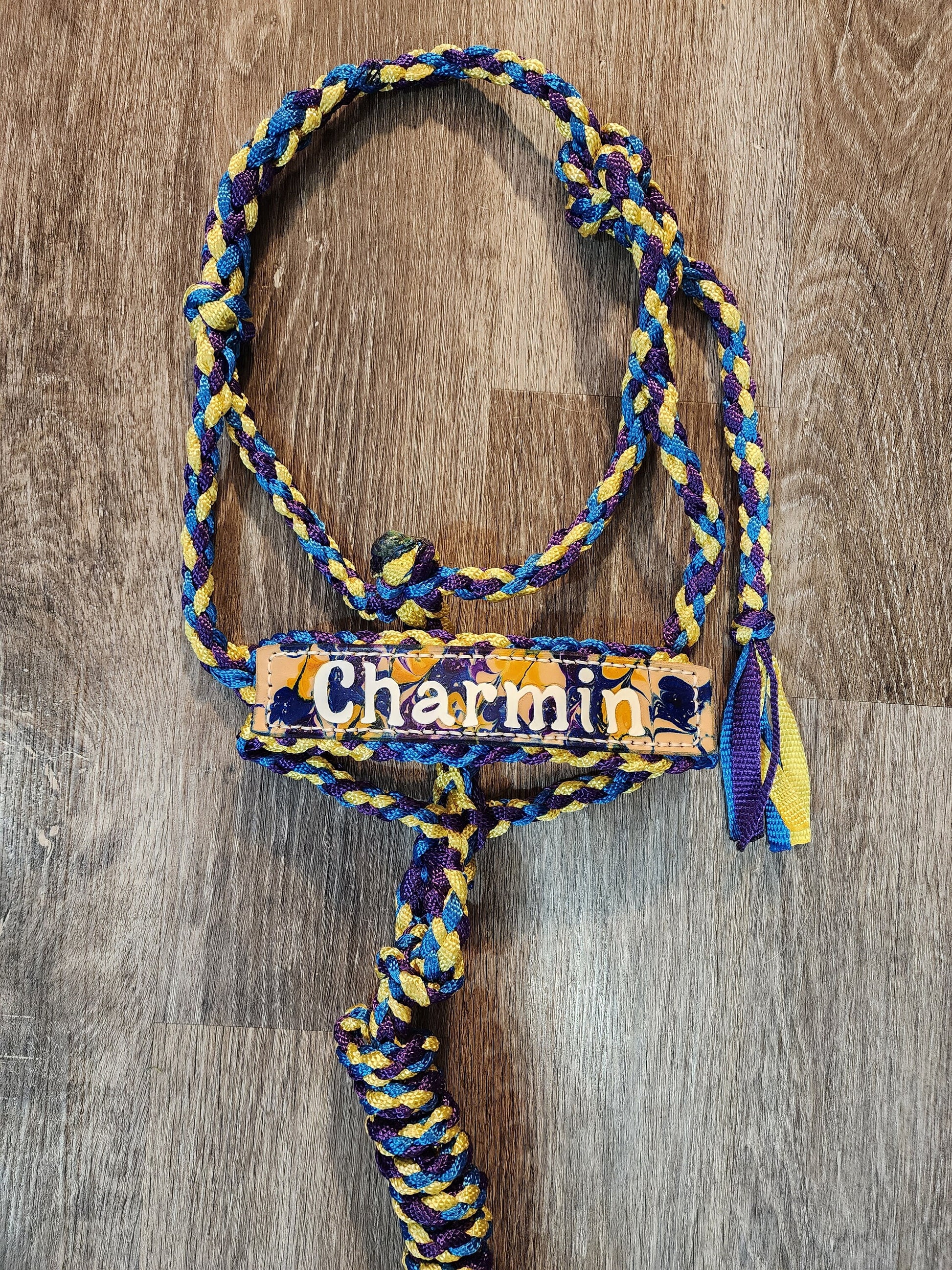 🐴 Key Features: - Hand-braided from 1,200 lb test-rated mule tape for incredible strength and resilience - Custom leather name patch—add your horse's name or a special phrase - Includes a matching 8-foot lead rope for a complete, cohesive set - Tight 6–13 strand construction for structure and lasting style - Lightweight, flexible, and resistant to weather and wear - Proudly handmade and dyed in the great state of Michigan