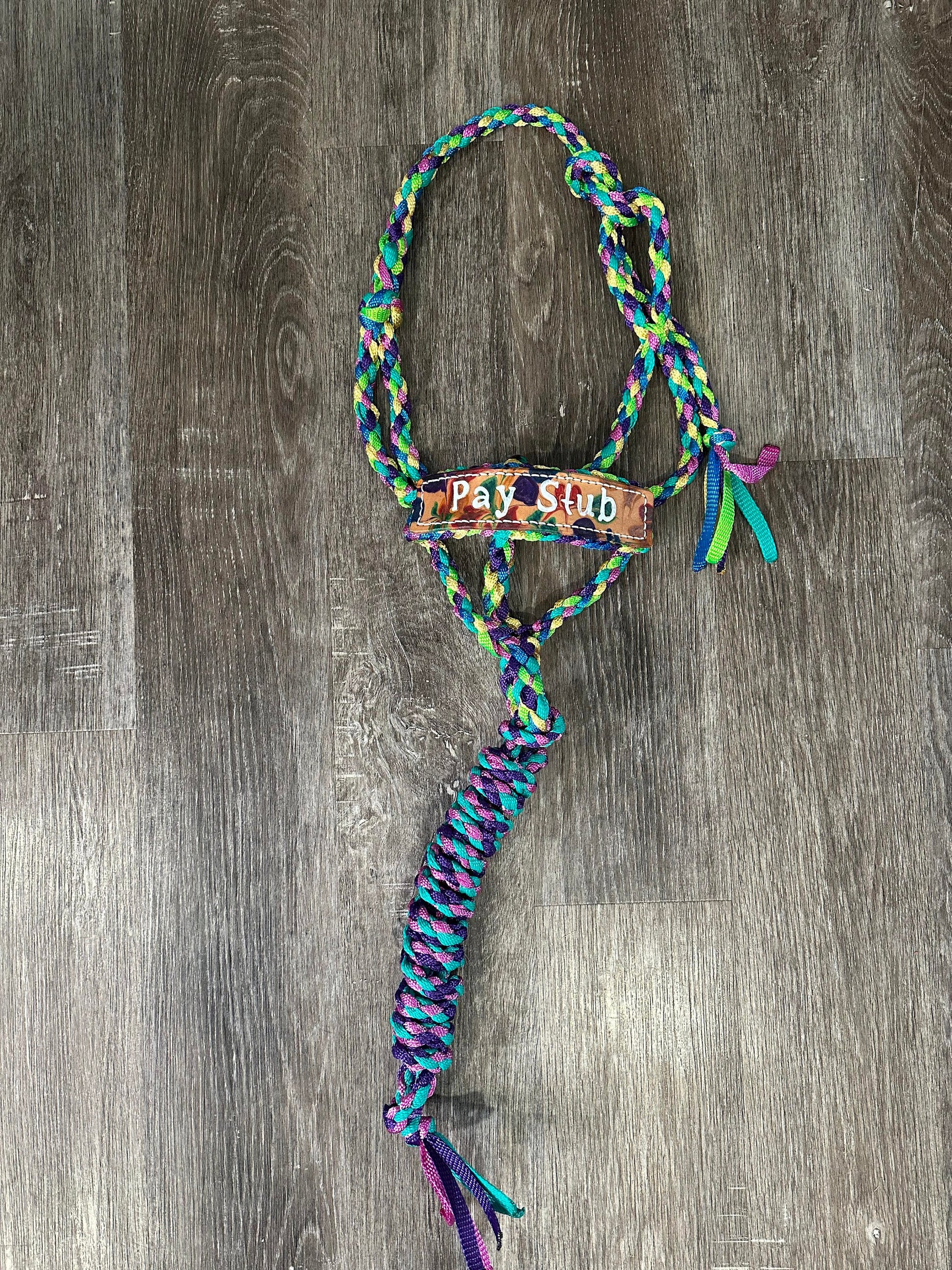 Give your horse gear a personal touch with this rugged and stylish mule tape halter featuring a custom leather name patch and a matching 8-foot lead. Hand-dyed and tightly braided in Michigan, each halter is built for comfort, strength, and everyday durability—made to work hard and look good doing it.