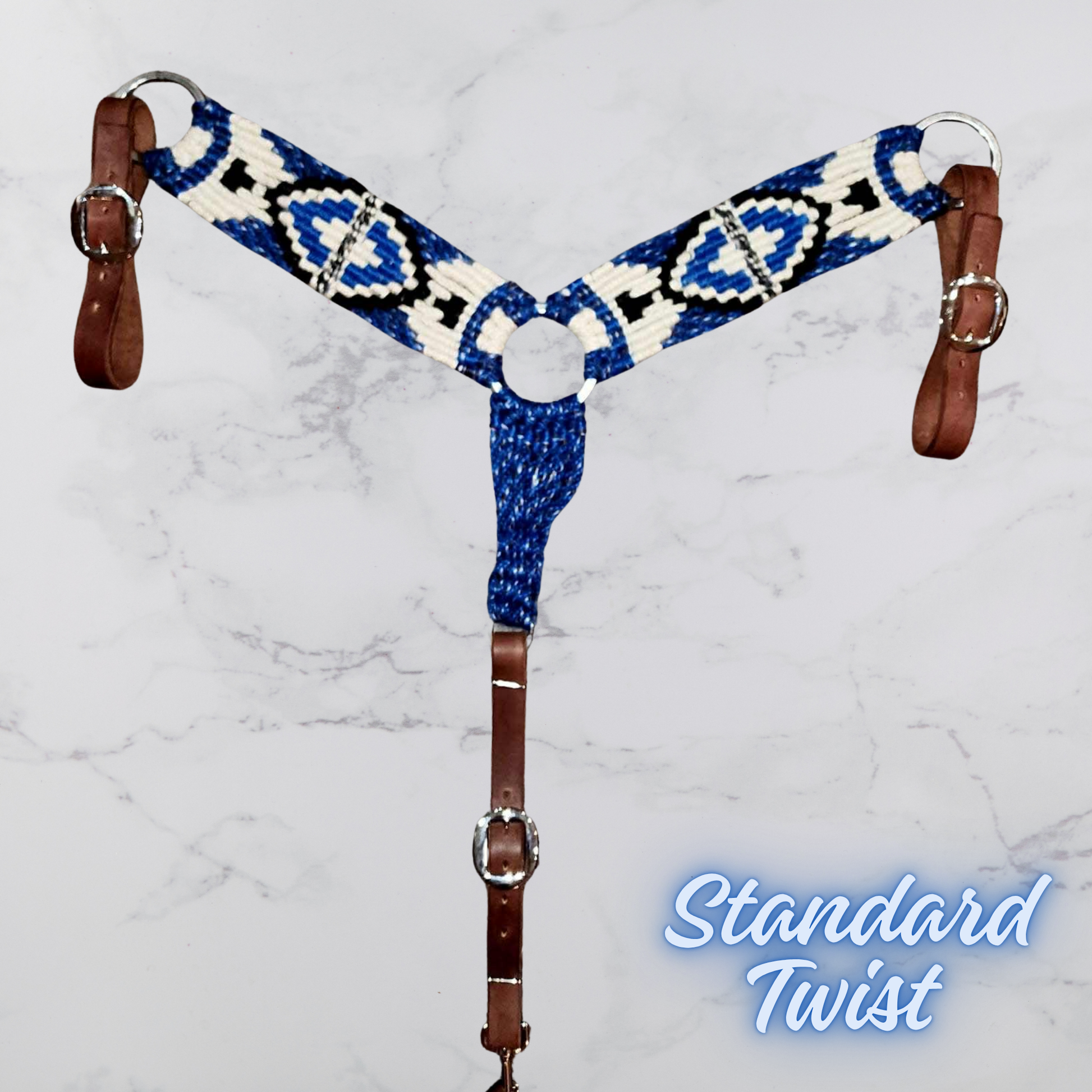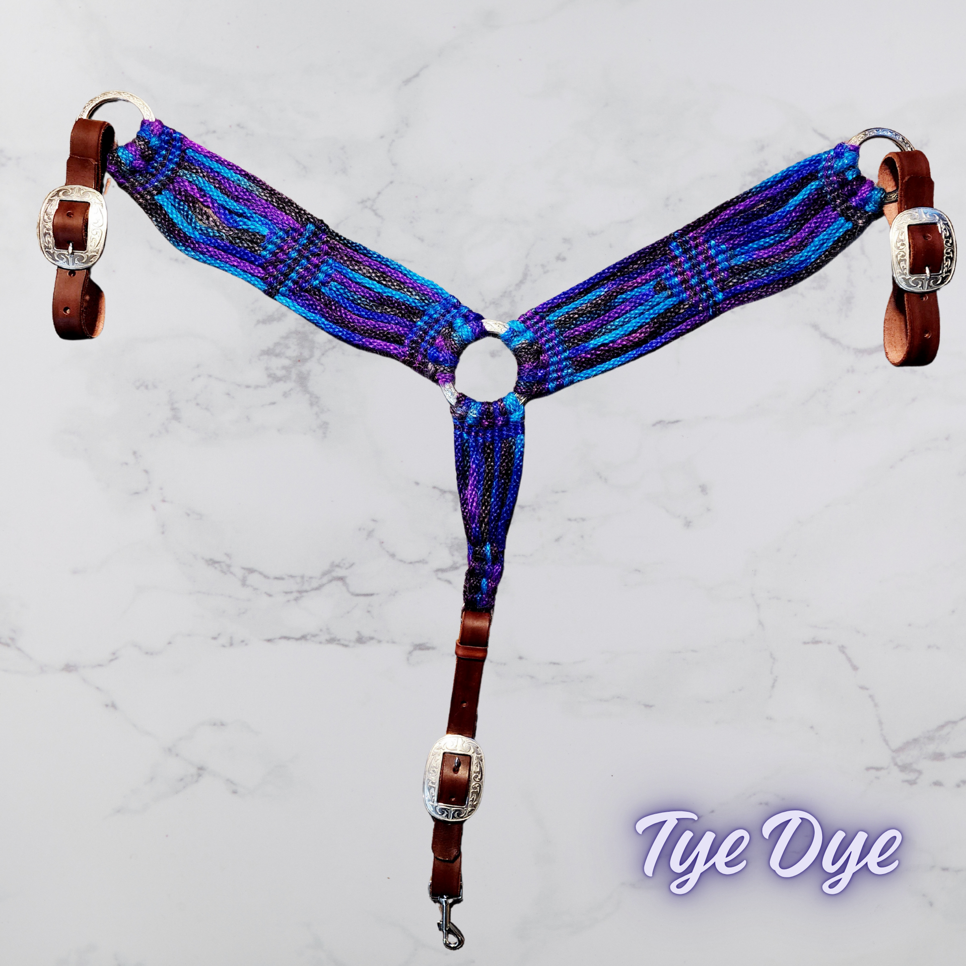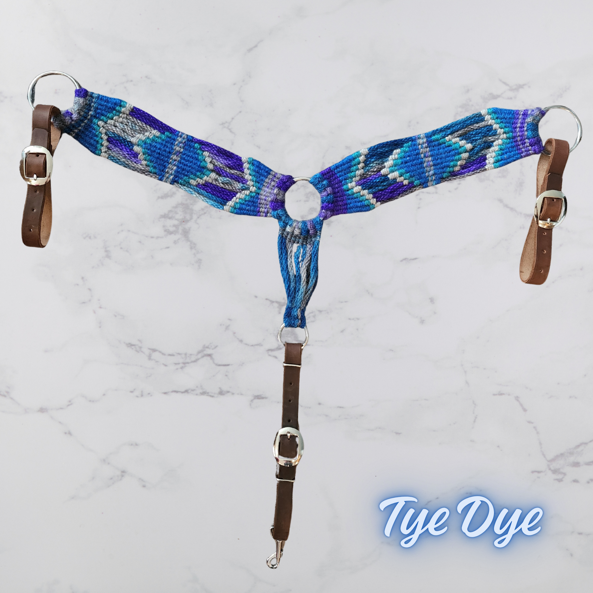 Design a one-of-a-kind breast collar that’s as bold or classic as you like. Each piece is hand-tied from 100% mohair in your choice of base style—solid, twisted, or tie-dye—and can be customized to match your vision. We also offer coordinating halters, wither straps, and headstalls to create a complete set that turns heads wherever you ride.
