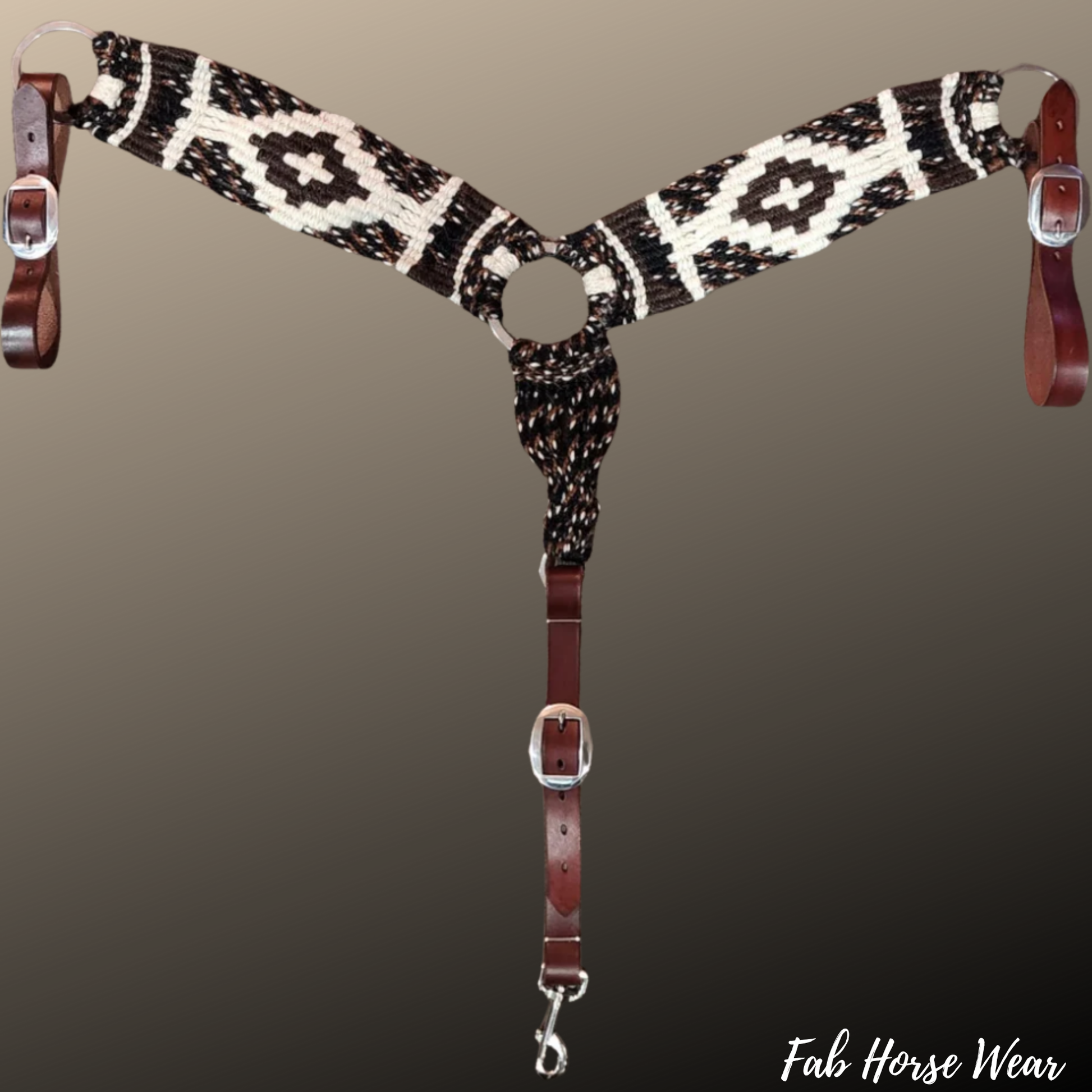 Timeless Western style meets everyday durability in this 100% mohair breast collar, hand-tied in a rich natural, brown, and black twist. Designed for comfort, strength, and eye-catching appeal, each piece is handmade with care and finished with premium leather tugs and downstrap by Fab Horse Wear, right here in Michigan.