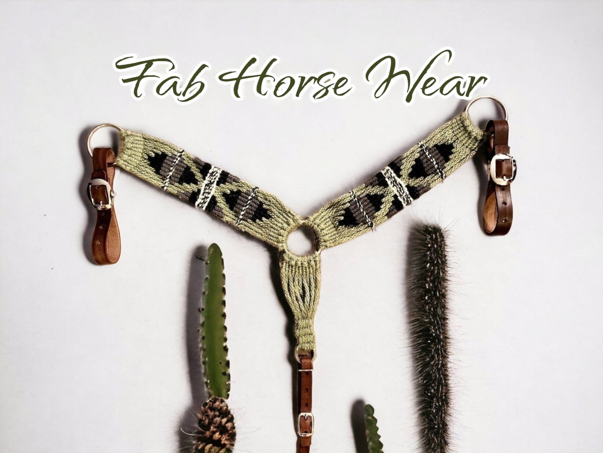 Crafted for comfort, style, and longevity, this 100% mohair breast collar features a soothing sage base with striking black, gray, and natural tones hand-tied into every strand. Each piece includes handcrafted leather tugs and a downstrap, made by Fab Horse Wear in the great state of Michigan.