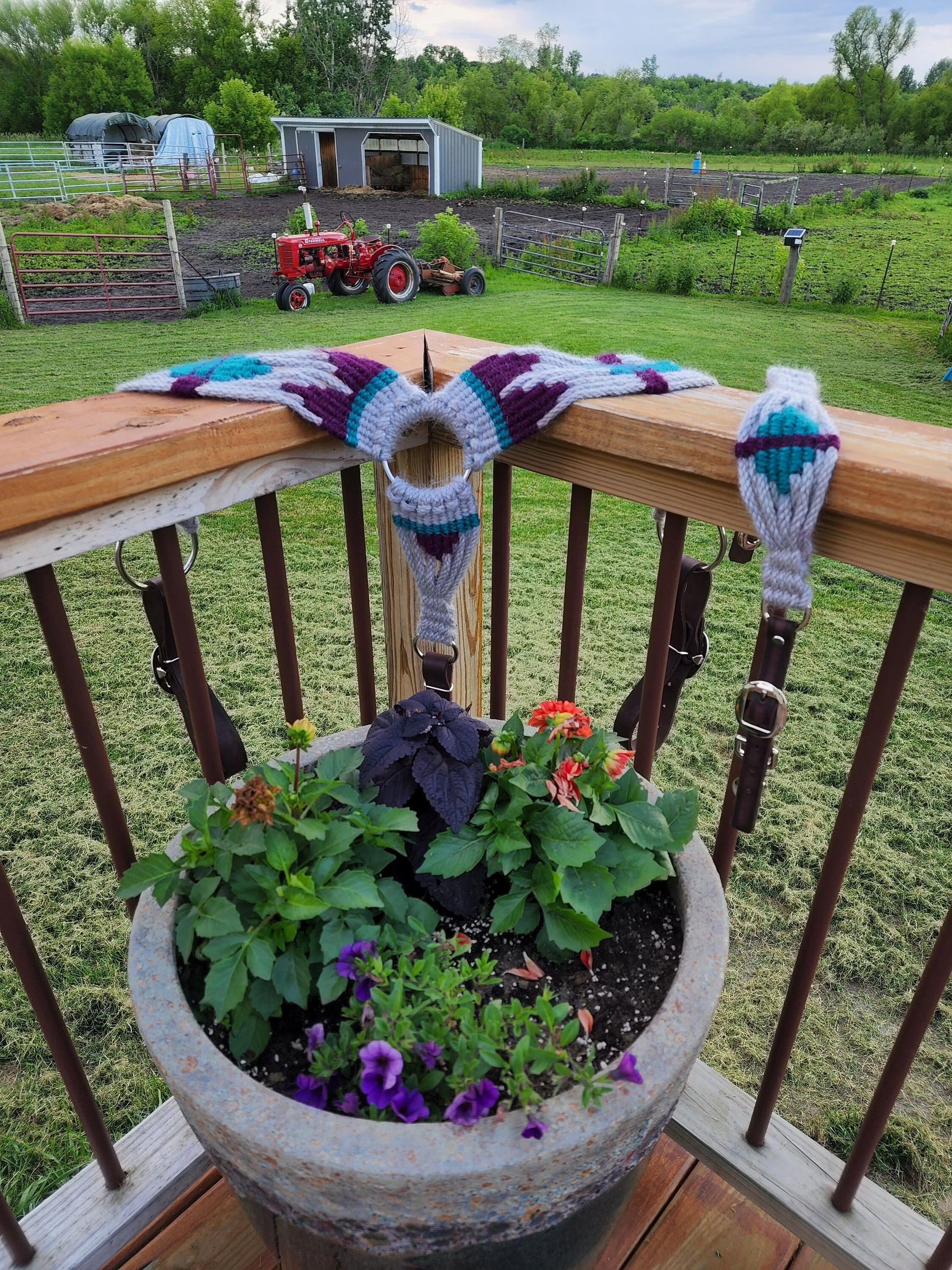 🐴 Product Highlights: - Braided from 100% mohair—lightweight, colorful, and naturally moisture-wicking - Hand-tied in a bold wine and turquoise pattern over a soft gray foundation - Finished with handmade leather tugs and downstrap for a polished, secure fit - Built with stainless steel hardware for long-term durability - Standard horse size; message us for custom sizing options