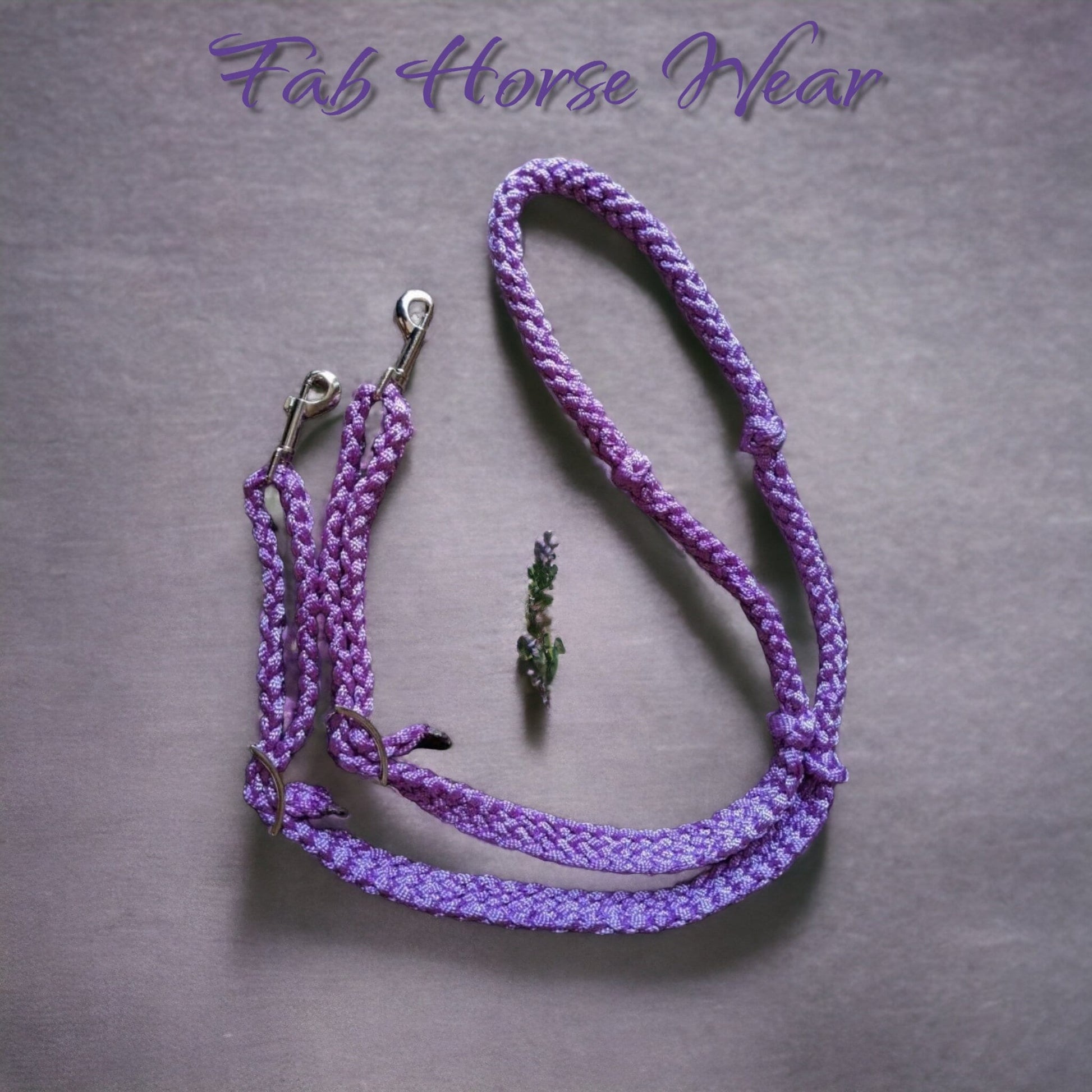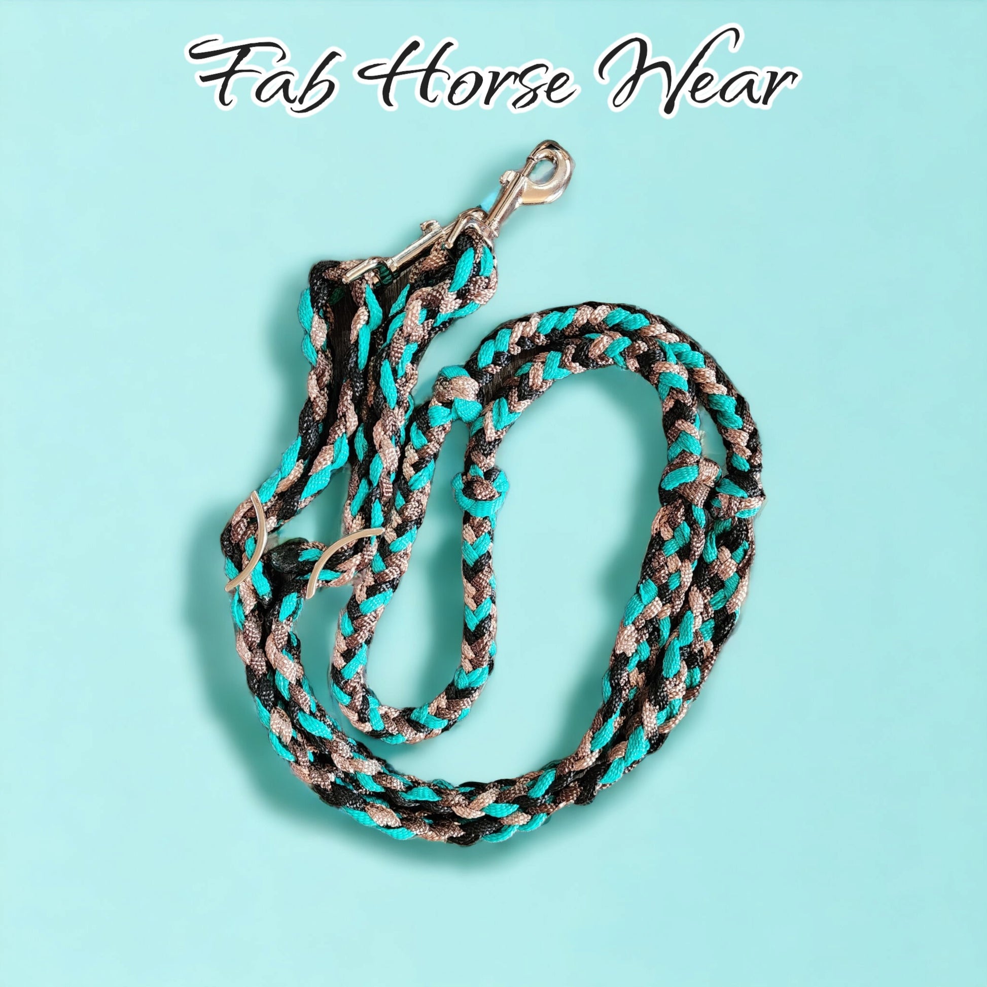 🔧 Product Features: - Custom Colors: Made in any color combo you choose—match your tack set, barn colors, or personality - Standard Length: 8 feet long (custom lengths available upon request) - Secure & Functional: Includes conway buckles and snaps on both ends for easy adjustment - Strength You Can Feel: Braided with 6–12 strand techniques using high-tensile mule tape - Made with Care: Designed and crafted in Michigan with pride and attention to detail
